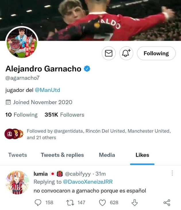 Đó là dòng chia sẻ trên trang twitter của một fan hâm mộ sau khi quyết định của Scaloni được đưa ra, và bất ngờ là nó đã được nhấn ‘yêu thích’ bởi tài khoản chính thức của Alejandro Garnacho. Hiện tại, Garnacho đã xóa bỏ động thái kể trên, nhưng nhiều người đã kịp ghi lại hình ảnh này và khiến mạng xã hội nổ ra tranh cãi.