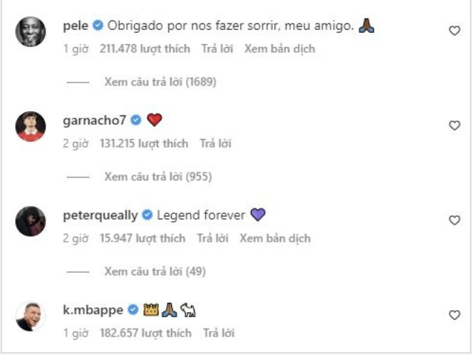 Ngoài Mbappe, tài khoản của huyền thoại Pele cũng viết bình luận động viên Ronaldo: “Cảm ơn vì những cống hiến. Bạn đã giúp người hâm mộ có những khoảnh khắc hạnh phúc”.