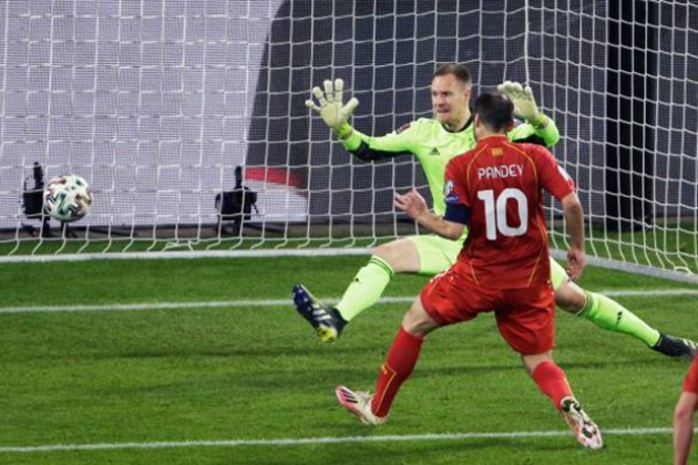 Pha bóng trên giống như điềm báo xấu với thầy trò Low khi đúng vào phút bù giờ đầu tiên của hiệp 1, Ter Stegen đã phải vào lưới nhặt bóng. Goran Pandev là người đệm bóng cận thành mở tỷ số sau một loạt pha di chuyển hợp lý và đan bóng ăn ý phía Bắc Macedonia.
