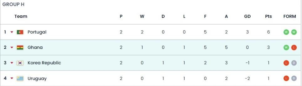 Hàn Quốc đứng thứ 3 với 1 điểm, hiệu số bàn thắng – bại là -1 sau trận hòa Uruguay và thất bại trước Ghana. Ở lượt đấu cuối, Son Heung-min và các đồng đội sẽ gặp Bồ Đào Nha của Cristiano Ronaldo còn Ghana chạm trán Uruguay.
