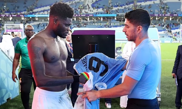 Sau khi tiếng còi mãn cuộc vang lên, một vài cầu thủ Ghana vẫn giữ thái độ khó chịu dành cho Suarez. Tuy nhiên Thomas Partey lại thể hiện sự thân thiện khi tiến đến đổi áo với cựu ngôi sao Barcelona.