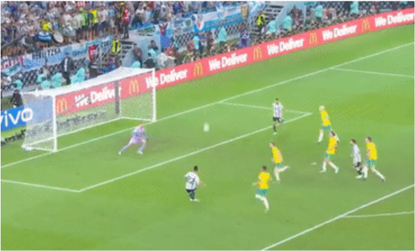 Đến phút 90+4, cơ hội lại mở ra với Lautaro ở vị trí tương tự, cũng từ đường chuyền của Messi. Tiền đạo thuộc biên chế Inter một lần nữa gây thất vọng với cú sút đúng vào vị trí của thủ môn Matthew Ryan.