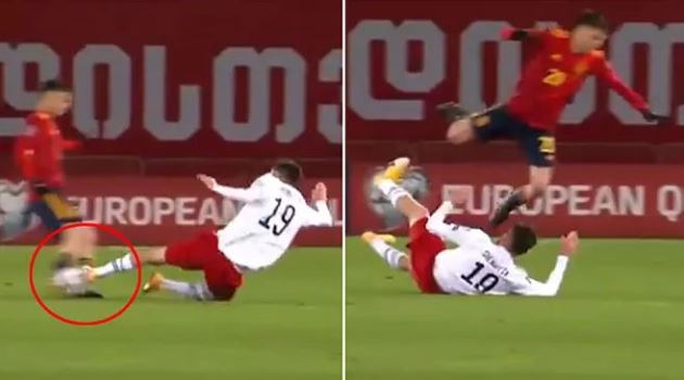 BongDa.com.vnTiền vệ Pedri của ĐTQG Tây Ban Nha đã chịu pha vào bóng bằng cả hai chân rất nguy hiểm của Levan Shengelia phía Georgia.