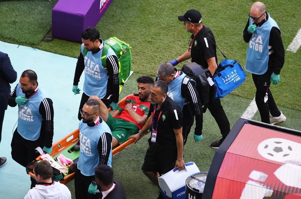 Mazraoui rời sân bằng cáng ở phút 60. Hậu vệ thuộc biên chế Bayern Munich đã gắng gượng thi đấu sau khi gặp vấn đề ở tình huống trước đó. Dù vậy, bắp đùi trái của Mazraoui tổn thương nặng và HLV của Morocco bắt buộc đưa anh ra nghỉ.