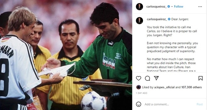 HLV Queiroz, thuyền trưởng Iran, không hài lòng với những bình luận của Klinsmann. Chiến lược gia này có một bài đăng khá dài trên trang cá nhân để phản pháo cựu HLV tuyển Mỹ. HLV Queiroz cho rằng nhận xét của Klinsmann mang tính xúc phạm.