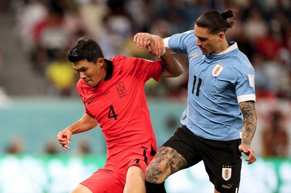 Kim Min-jae (số 4) bị chấn thương ở trận gặp Uruguay hôm 24/11. Ảnh: Reuters.
