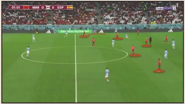 Nhóm 4 cầu thủ này cùng tiền đạo Youssef En-Nesyri có nhiệm vụ phòng ngự theo trục dọc. Bóng đến khu vực của cầu thủ nào, cầu thủ đó sẽ dâng cao áp sát ngay ở thời điểm bóng lăn. Đặc biệt, Ziyech và Boufal luôn luôn gây áp lực theo hướng từ biên vào trong, để buộc cầu thủ kiểm soát bóng của Tây Ban Nha phải hướng trái bóng vào khu vực trung lộ, nơi Marocco sẵn sàng tranh chấp ở cường độ cao hơn với hàng tiền vệ giàu năng lượng và hàng thủ 4 người sẵn sàng lao lên trước mặt đúng thời điểm.
