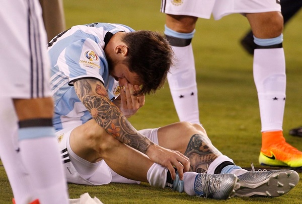 Đến năm 2016, gánh nặng ấy trở nên quá lớn. Messi khi đó đã tham dự ba kỳ World cup, hai lần thất bại ở tứ kết và một lần gục ngã ở chung kết. Và giờ lại đến thất bại thứ ba liên tiếp tại Copa America: Sau trận hòa bế tắc ở chung kết năm 2016 với Chile, Messi sút vọt xà ngang trong loạt luân lưu. Sergio Aguero khẳng định anh chưa bao giờ thấy người đồng đội và bạn thân của mình “tan vỡ” đến thế trong phòng thay đồ sau đó.